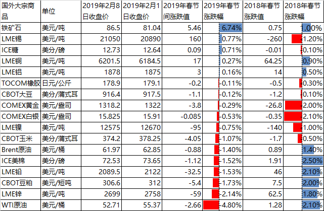 2019年春節(jié)期間,受對世界經(jīng)濟(jì)增長放緩的擔(dān)憂大宗商品價格基本以小幅度下跌為主,其中尤以原油價格下跌為甚。