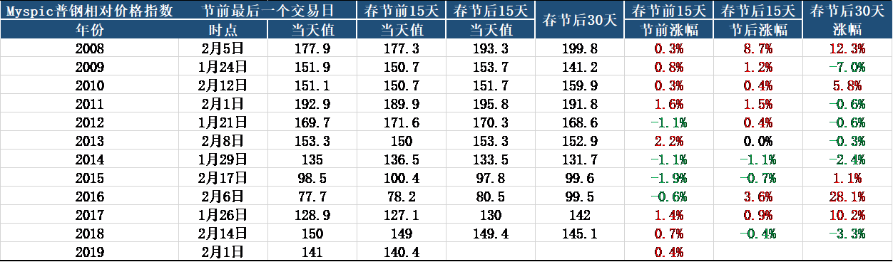 具體價格方面,從往年Myspic普鋼先對價格指數(shù)的春節(jié)前后對比來看,最近十年有70%的概率節(jié)日前后15日價格漲跌趨勢一致。2019年春節(jié)前15日鋼價指數(shù)累計(jì)小幅上漲0.4%,預(yù)計(jì)開門紅行情大概率出現(xiàn)。